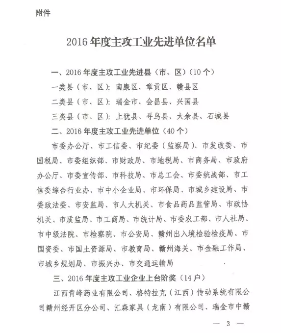 近日,贛州市委、市政府印發(fā)贛市字〔2017〕8號文件,通報(bào)表彰全市2016年度主攻工業(yè)先進(jìn)單位,167個(gè)縣(市、區(qū))、市直(駐市)部門和企業(yè)獲得表彰。其中,南康區(qū)、瑞金市、上猶縣等10個(gè)縣(市、區(qū))榮獲“2016年度主攻工業(yè)先進(jìn)縣(市、區(qū))”稱號;市委辦公廳、市工信委等40個(gè)單位榮獲“2016年度主攻工業(yè)先進(jìn)單位”稱號;江西青峰藥業(yè)有限公司等14戶企業(yè)榮獲“2016年度主攻工業(yè)企業(yè)上臺階獎(jiǎng)”;贛州市深聯(lián)電路有限公司等103戶企業(yè)榮獲“2016年度主攻工業(yè)成長型企業(yè)獎(jiǎng)”。