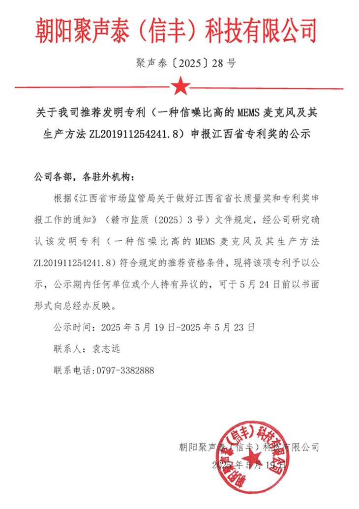 • 《一種信噪比高的MEMS麥克風(fēng)及其生產(chǎn)方法》江西省專(zhuān)利獎(jiǎng)的公示